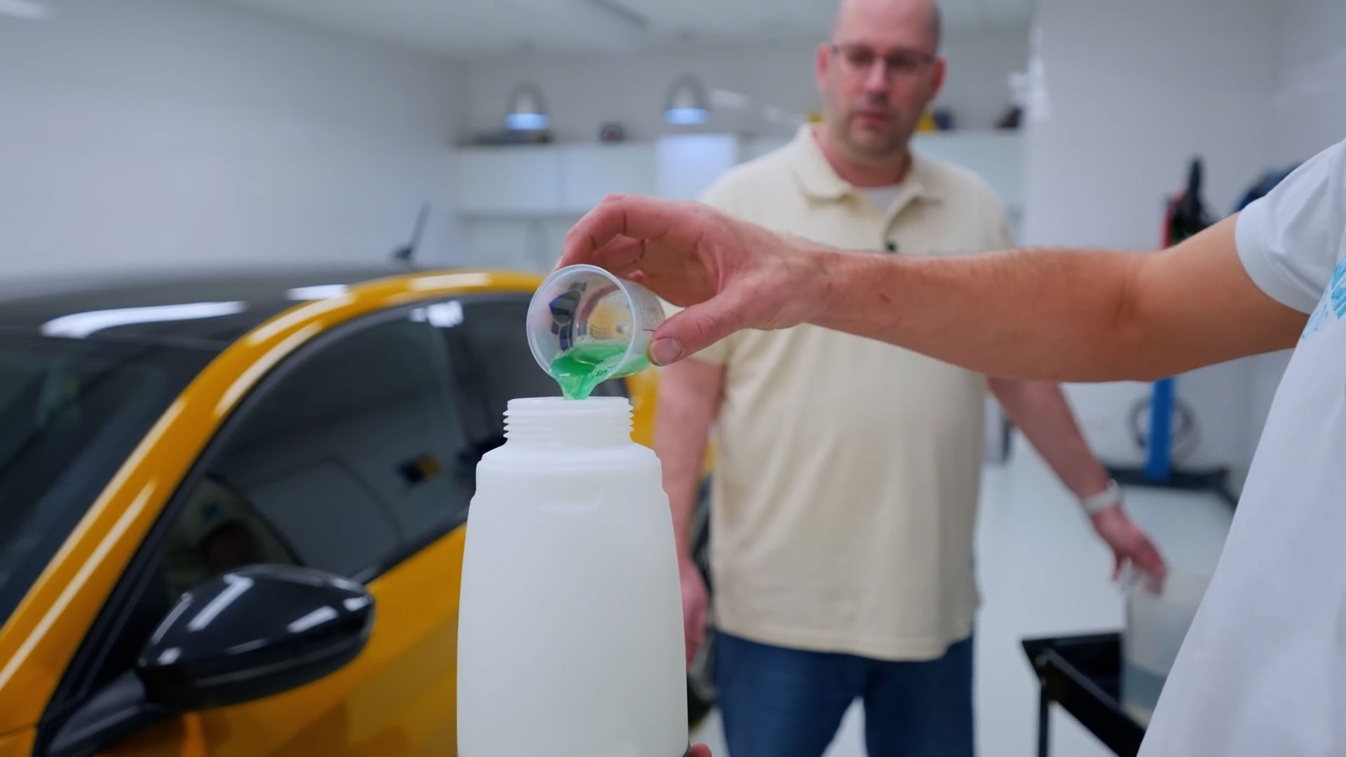 Nee hoor, maar je moet wel ongeveer die verhouding aanhouden. Gebruik een pompverstuiver, bijvoorbeeld van IK, waarmee je het vervuilde oppervlak insprayt. Let er daarbij op dat je niet teveel tegen je lak aan beweegt, om krassen te voorkomen. Laat het 5-10 minuten intrekken en spuit het vervolgens met de hogedrukspuit (met de korte trigger) af.