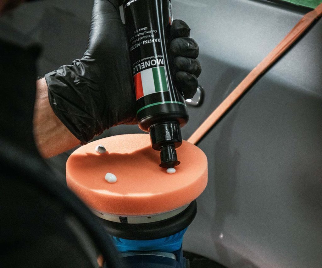 Nadat je grof hebt gepolijst, ga je verfijnen. Meestal in twee stappen: eerst één stapje fijner, met een medium polish met medium polishing pad. En daarna de finishing polish met een finishing pad om de glans helemaal op te halen.