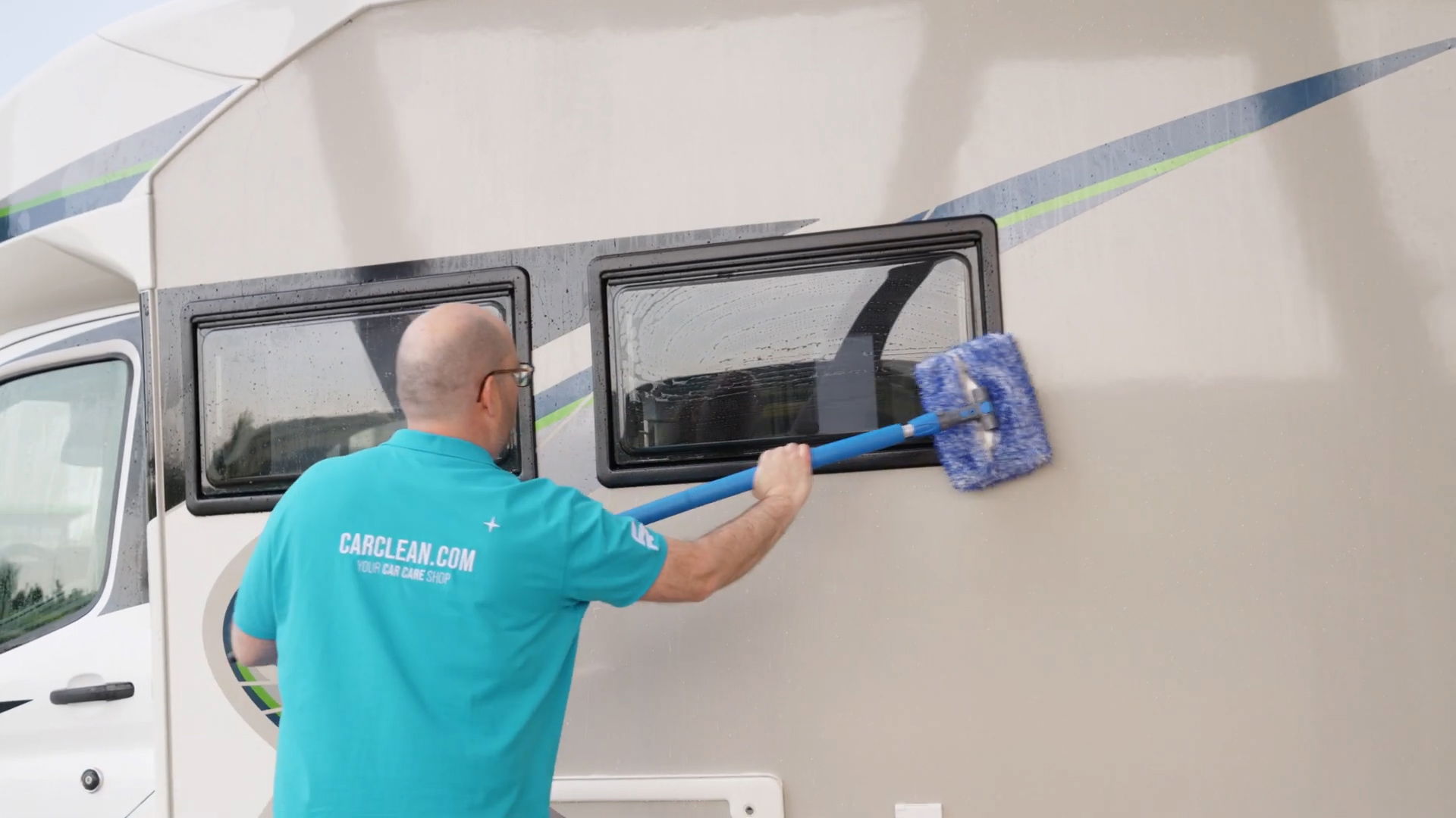 Thoroughly rinse the motorhome or caravan with a pressure washer. Afterward, you’ll need to dry it, but this is much easier as it’s coated. Just make sure to rinse the washmitt after use or put it in the washing machine.