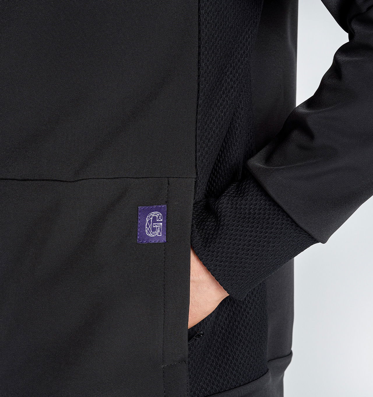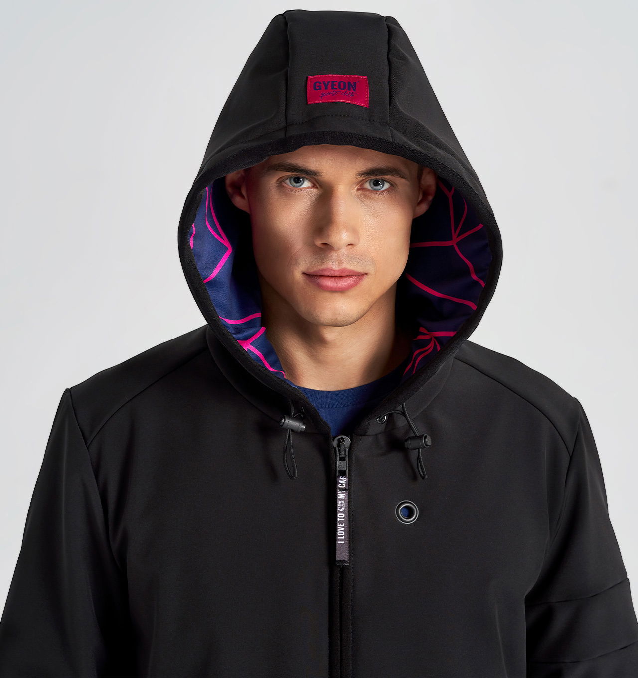 De Gyeon Soft Shell Jacket is een mooie jas uitgevoerd in zwart. Voorzien van capuchon met Gyeon-kristalpatroon aan de binnenkant en Gyeon Quartz-logo bovenop. Gyeon-label aan de ritssluiting, twee steekzakken en een binnenzak, alle met ritssluiting. De binnenkant is gemaakt van fleece. De jas is voorzien van een speciaal gat voor je oordopjes als je de telefoon aan binnenkant wilt dragen. Kijk voor de juiste maat op het schema bij de afbeeldingen van dit product.
