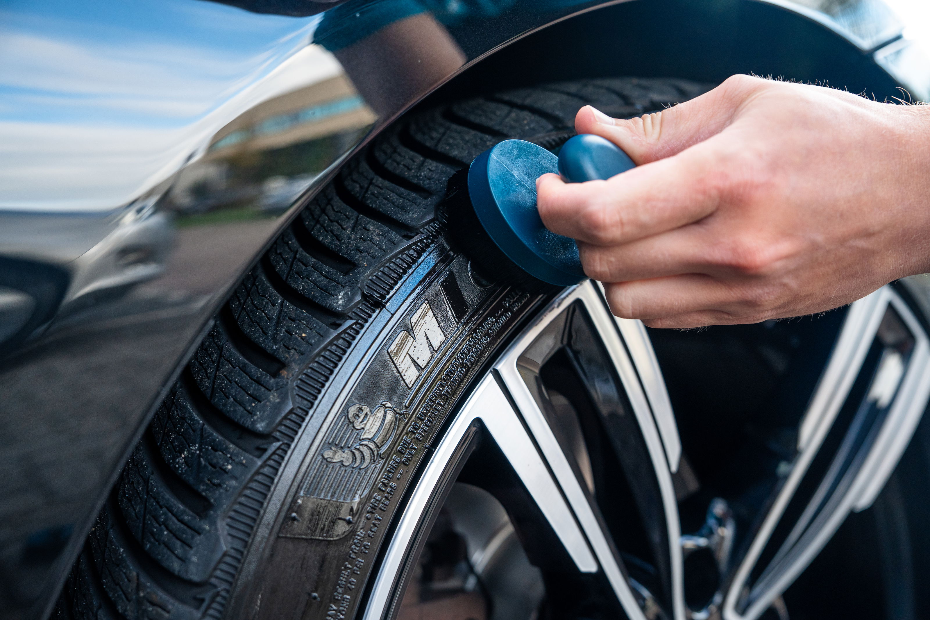 - Spuit een bandenreiniger of -verzorgingsproduct op de band of rechtstreeks op de borstel.