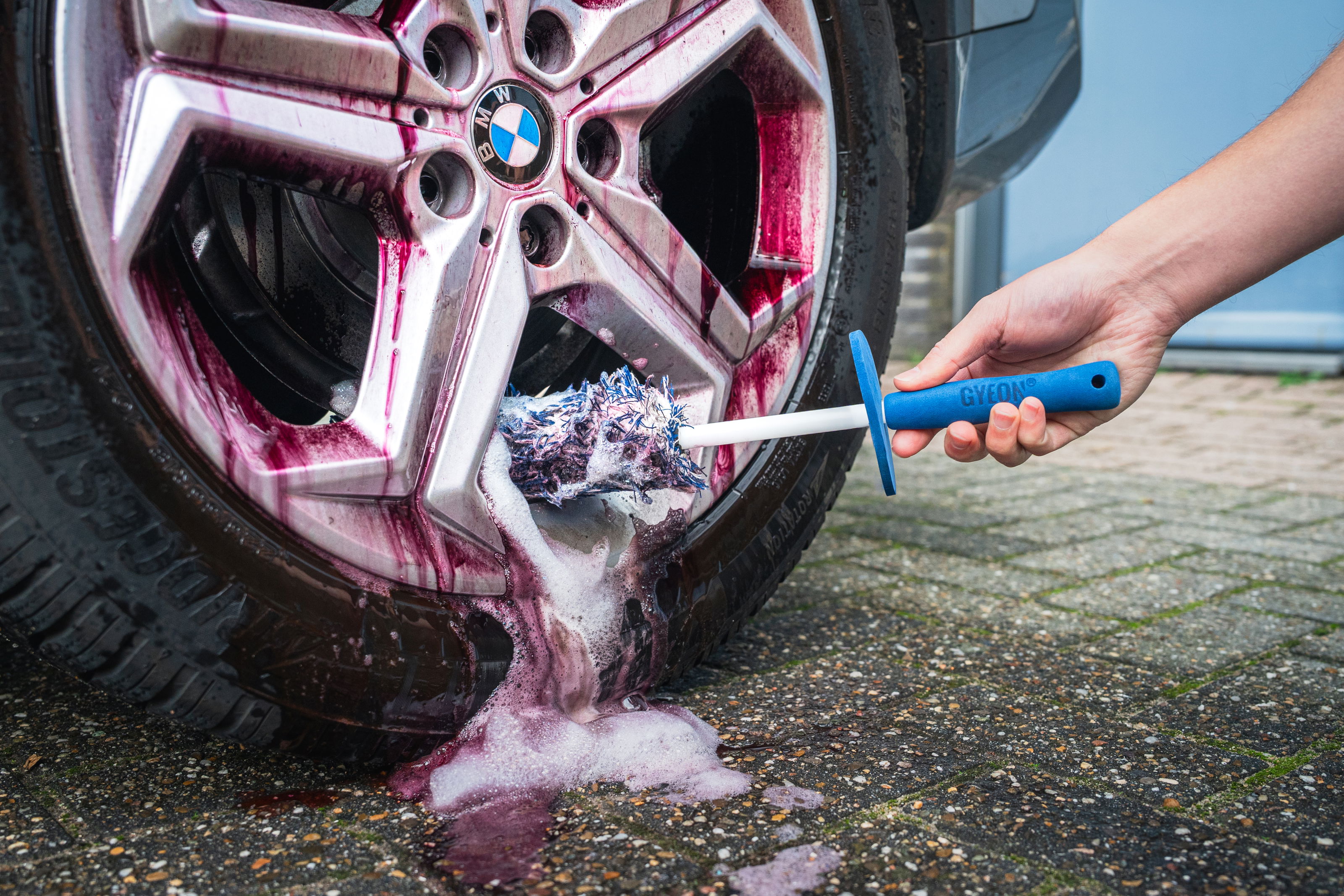 Begin altijd bij de velgen, en doe dat zonder ze eerst nat te maken. Door eerst te foamen met actief schuim en daarna met een schoon water programma met osmosewater af te spuiten, haal je 95% van het vuil al weg. Vervolgens gebruik je een scheutje shampoo GYEON Q²M Bathe in een emmer osmosewater om de velgen verder te wassen. Daarna spuit je de auto nog een keer onder hoge druk af en kun je door naar de volgende stap.