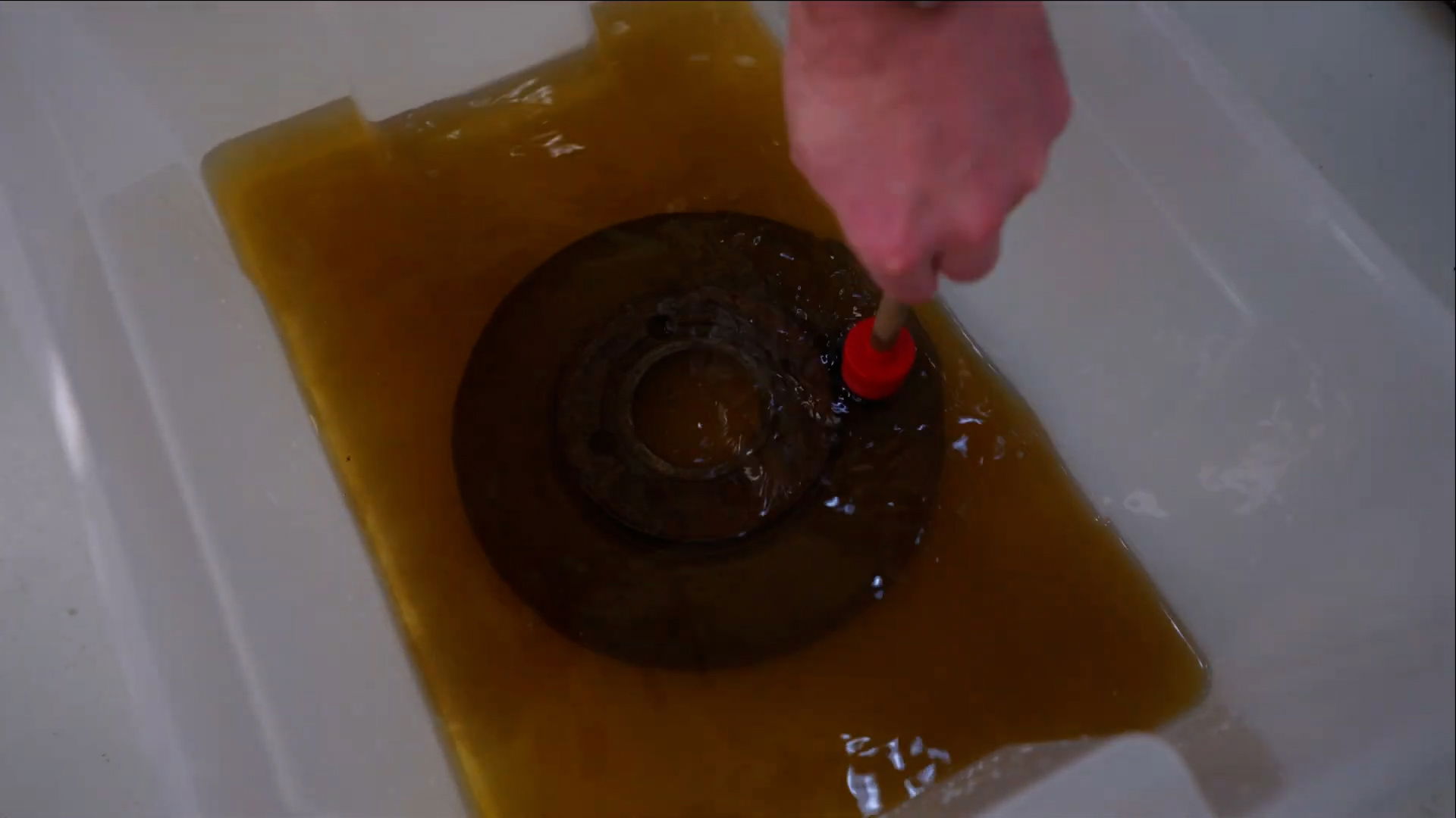 Eerst moeten alle kristallen opgelost zijn. Dat doe je door te roeren. Daarna leg je het verroeste onderdeel erin.