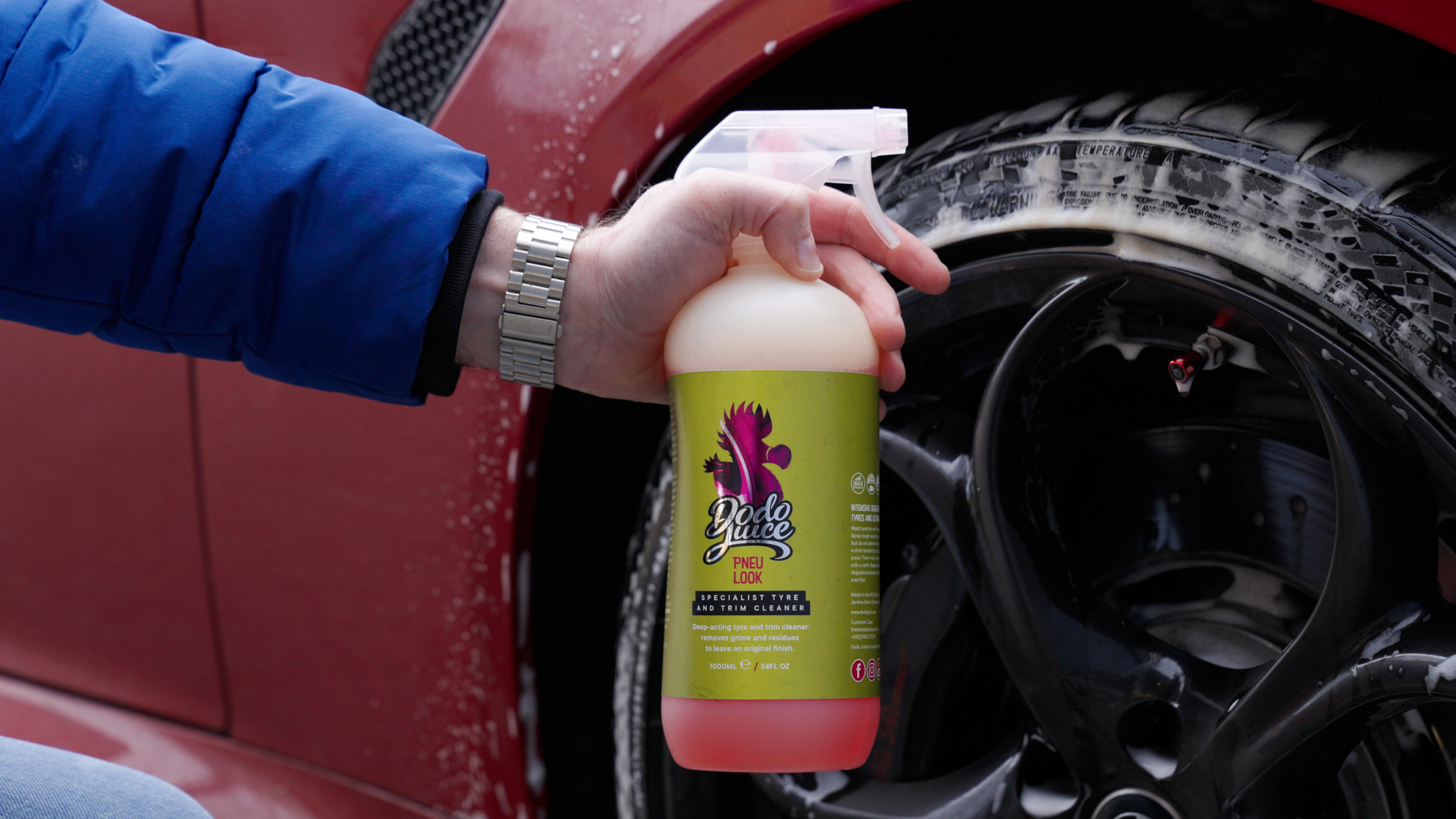Spoel de banden eerst af om losse vervuiling te verwijderen. Spray Pneu Look royaal op de band en werk het product in met een borstel. Spoel daarna grondig af met water. Wil je de banden drogen voordat je een dressing aanbrengt, gebruik dan een pluisvrije doek. Dit hoeft vaak niet eens, omdat de dressing ook prima hecht op een licht vochtige band.