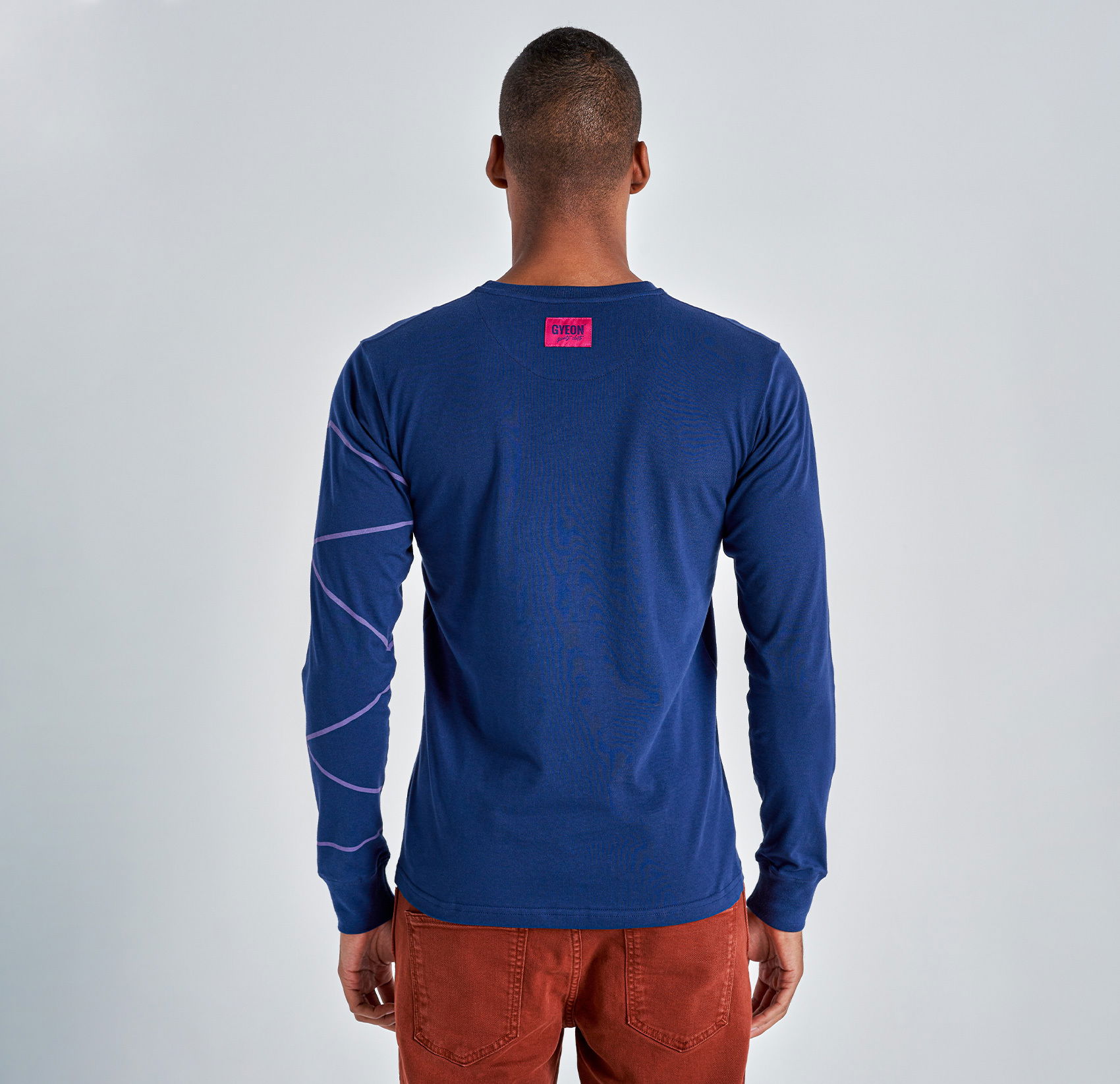 Gyeon Long Sleeve in Navy Blue. Aan de voorzijde in het klein: IN G WE TRUST.