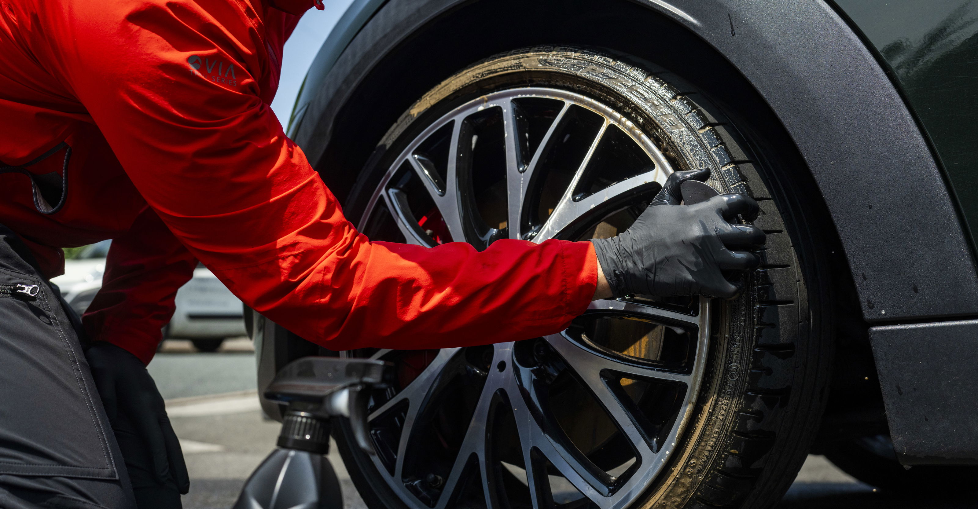 - Spray de Q²M TireCleaner op een natte band en werk deze in met een stevige borstel
