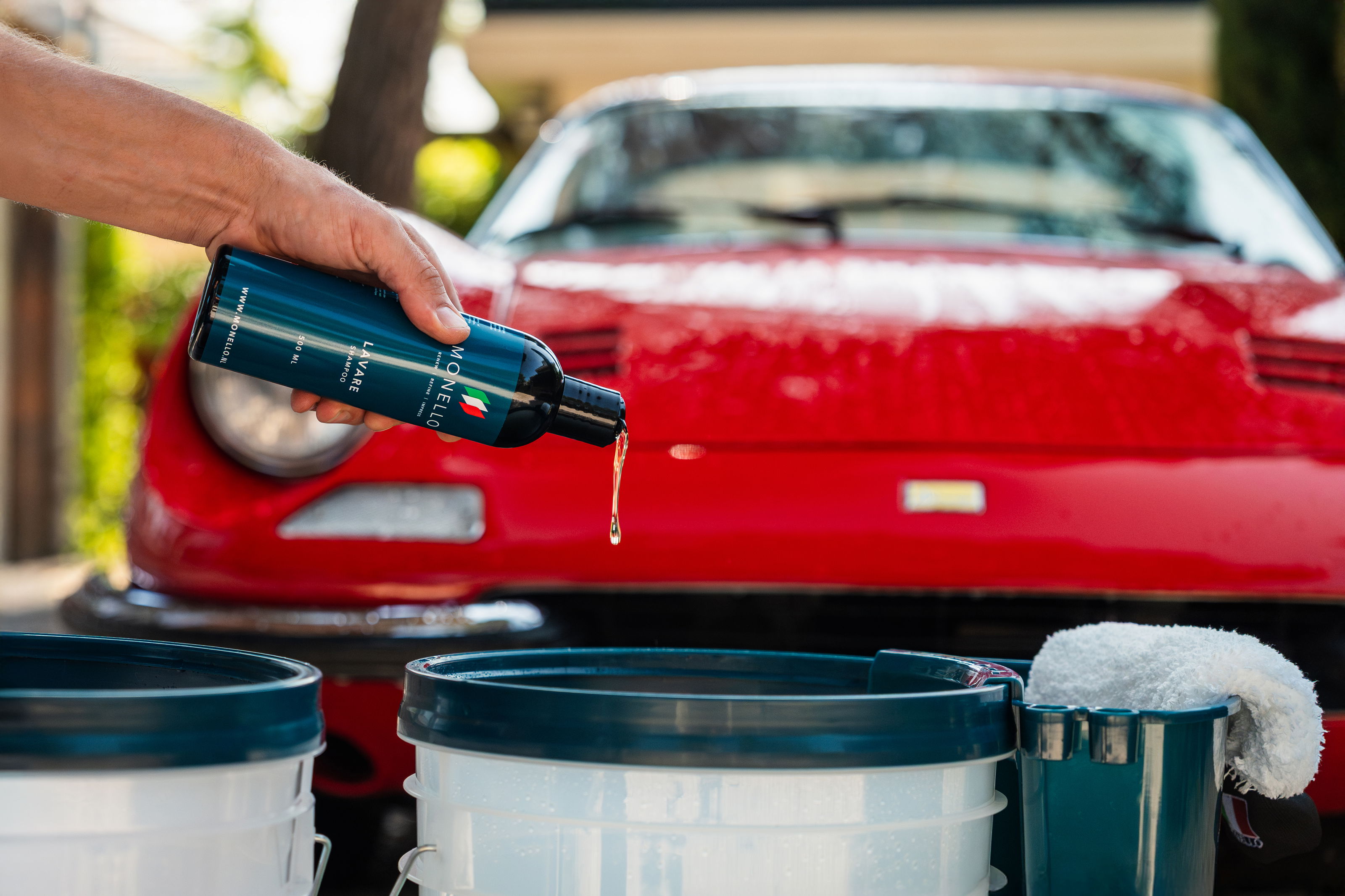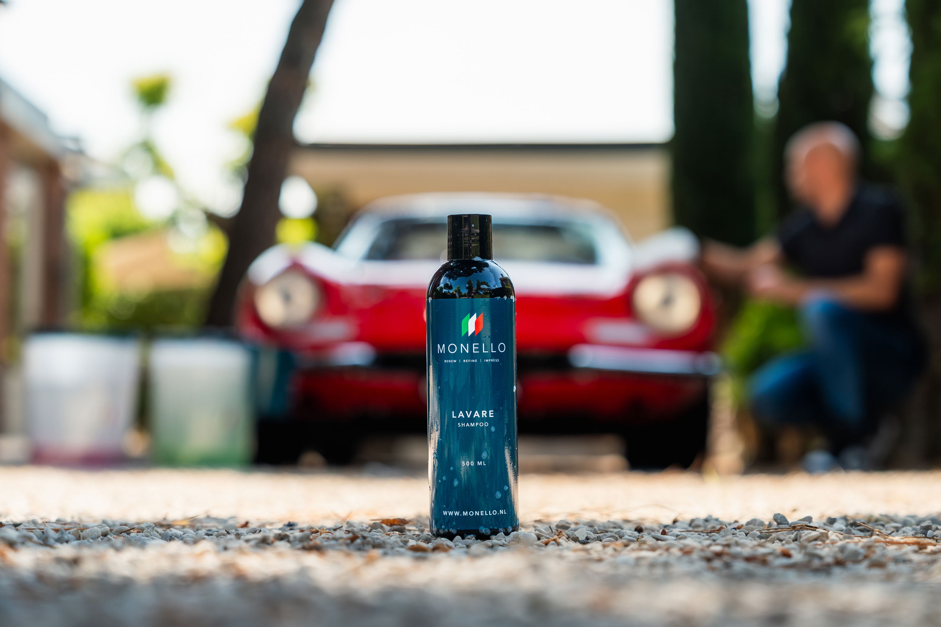 Vul een emmer met 10 liter water en voeg 16 ml Monello Lavare shampoo toe. De shampoo is pH-neutraal en veilig voor alle laksoorten, inclusief matte lak en wraps.