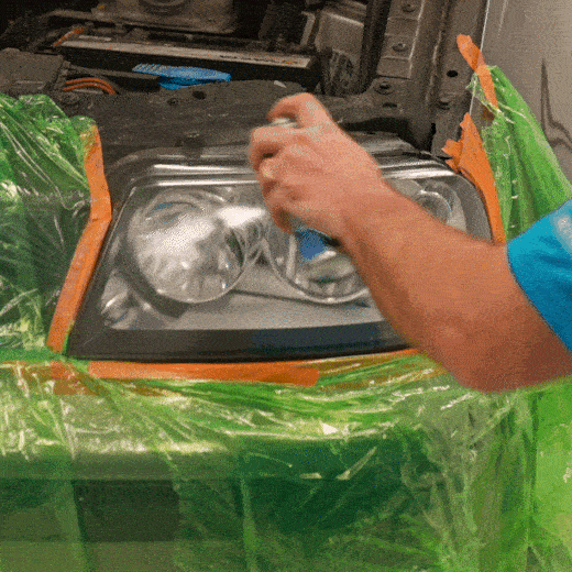 - Spuit een gelijkmatige laag Keep Clear Headlight Coating op de koplampen van ongeveer 10-15 cm afstand met 50% overlap.