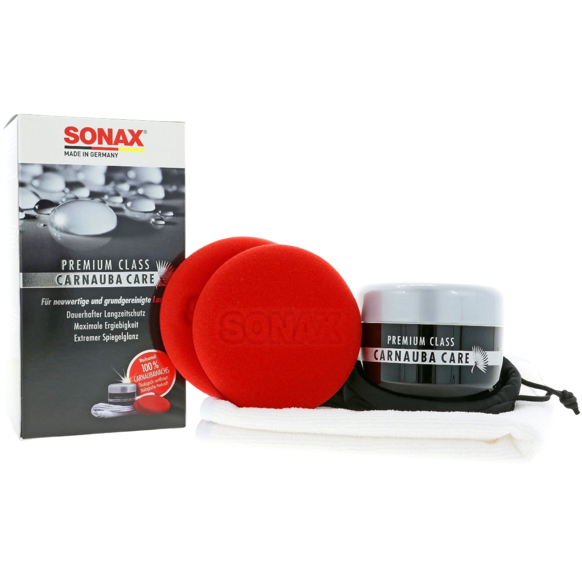SONAX Premium Class Carnauba Care Wax bestaat uit 100% zuivere "grade one" carnaubawax. De dichte moleculaire structuur biedt maximale UV-bescherming en zorgt voor langdurige kleurdichtheid. Carnauba Care Wax zorgt voor optimale bescherming tegen invloeden van buitenaf en brengt een diepe glans.