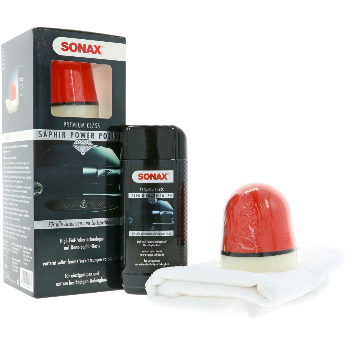 De polijstset bevat een speciale SONAX P-Ball met spons en een hoogwaardige microvezeldoek.